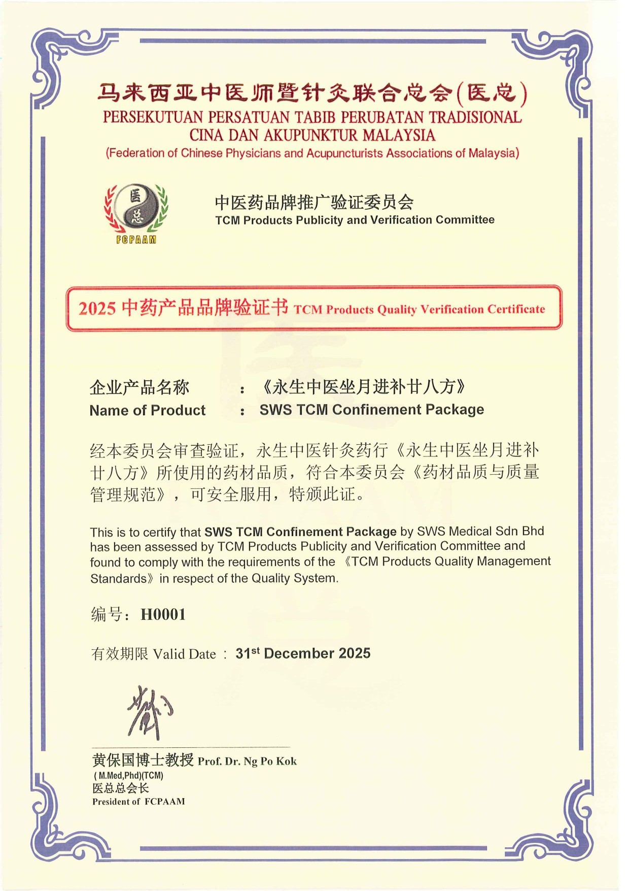 本行从马来西亚医总总会长 ~ 黄保国博士手中, 获颁“传统药材品质验证”给于“坐月进补廿八方”.
